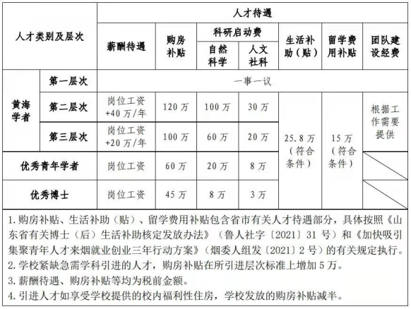 根据专业能力和学术水平,引进人才分为黄海学者(第一层次、第二层次、第三层次)、优秀青年学者、优秀博士等3个人才类别和5个人才层次。具体如下表: