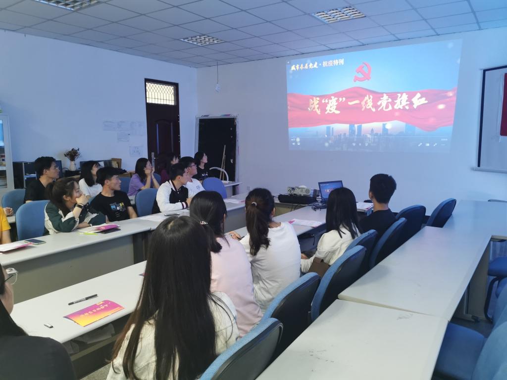 活动在嘹亮的国歌声中拉开帷幕。首先,全体党员集体过政治生日,每位党员收到了一份写有入党誓词和寄语的政治生日贺卡,并在支部书记的带领下,举起右拳,面向党旗庄严的重温入党誓词。全体党员依次以铿锵有力的声音重读自己的入党申请书,回顾自己的入党初心和入党历程,回顾入党志愿的庄严承诺和坚定决心。接着,全体党员共同观看了公益专题片《战“疫”一线党旗红》。影片再现了在这场全国疫情抗击战中,随处可见的党员干部作为“先锋队”“突击手”努力奋战的身影。“生命重于泰山、疫情就是命令,防控就是责任”,这是共产党员赤诚的誓言。一份份写给党组织的“请战书”、一枚枚鲜红的“手指印”彰显出心中的信仰,表达了党员对党的忠诚、对人民的热爱、对自己初心使命的坚守。通过观影,大家再次得到了精神上的洗礼。
