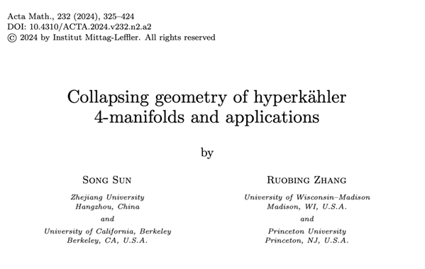 近日,烟台大学数学与信息科学学院2007级校友张若冰与浙江大学数学高等研究院教授孙崧合作的题为《Collapsing geometry of hyperkähler 4-manifolds and applications》(四维超凯勒流形的坍缩几何及其应用)的研究成果在国际顶尖数学期刊《Acta Mathematica》上发表。文章对四维超凯勒的流形坍缩几何进行了研究,并证明了该领域内的两个著名猜想,为该领域的一项重大突破。