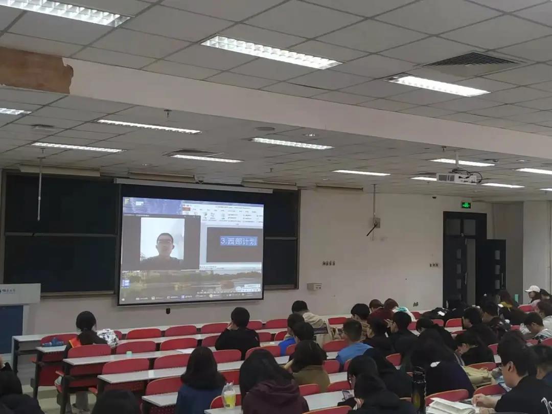 现场连线了在新疆喀什地区麦盖提县进行西部计划工作的16级学生张惠民,他向同学们讲述了参加西部计划的心路历程,在基层服务的丰富经历以及作为西部计划志愿者的收获,对同学们关注的岗位分配、生活补贴和激励政策等问题进行了一一解答。