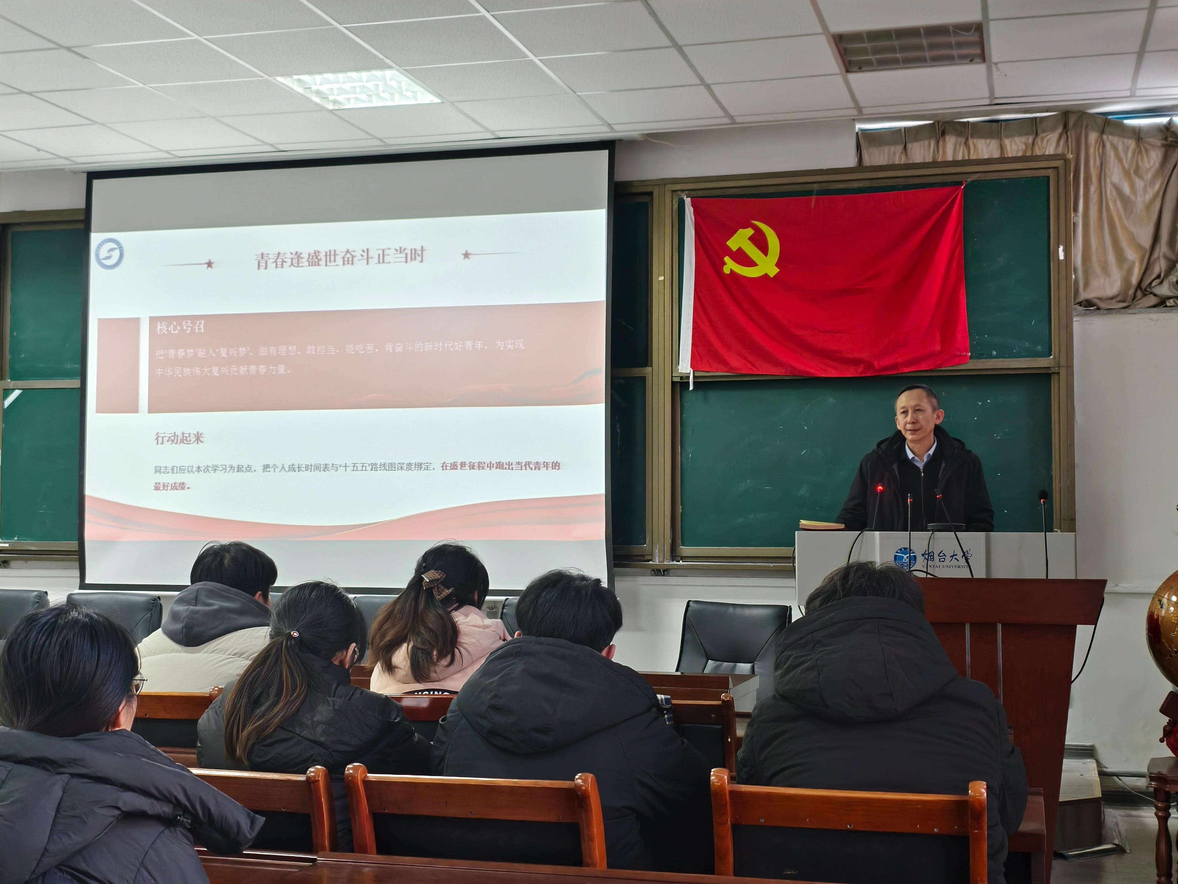 2025年12月4日,烟台大学数学与信息科学学院学生第一党支部召开主题党日,党支部书记张晔同志首先以“青春向党学全会 强国复兴勇担当”为主题领学党的二十届四中全会精神,解读重大战略部署与新时代要求,强调青年党员应自觉将个人理想融入国家发展。