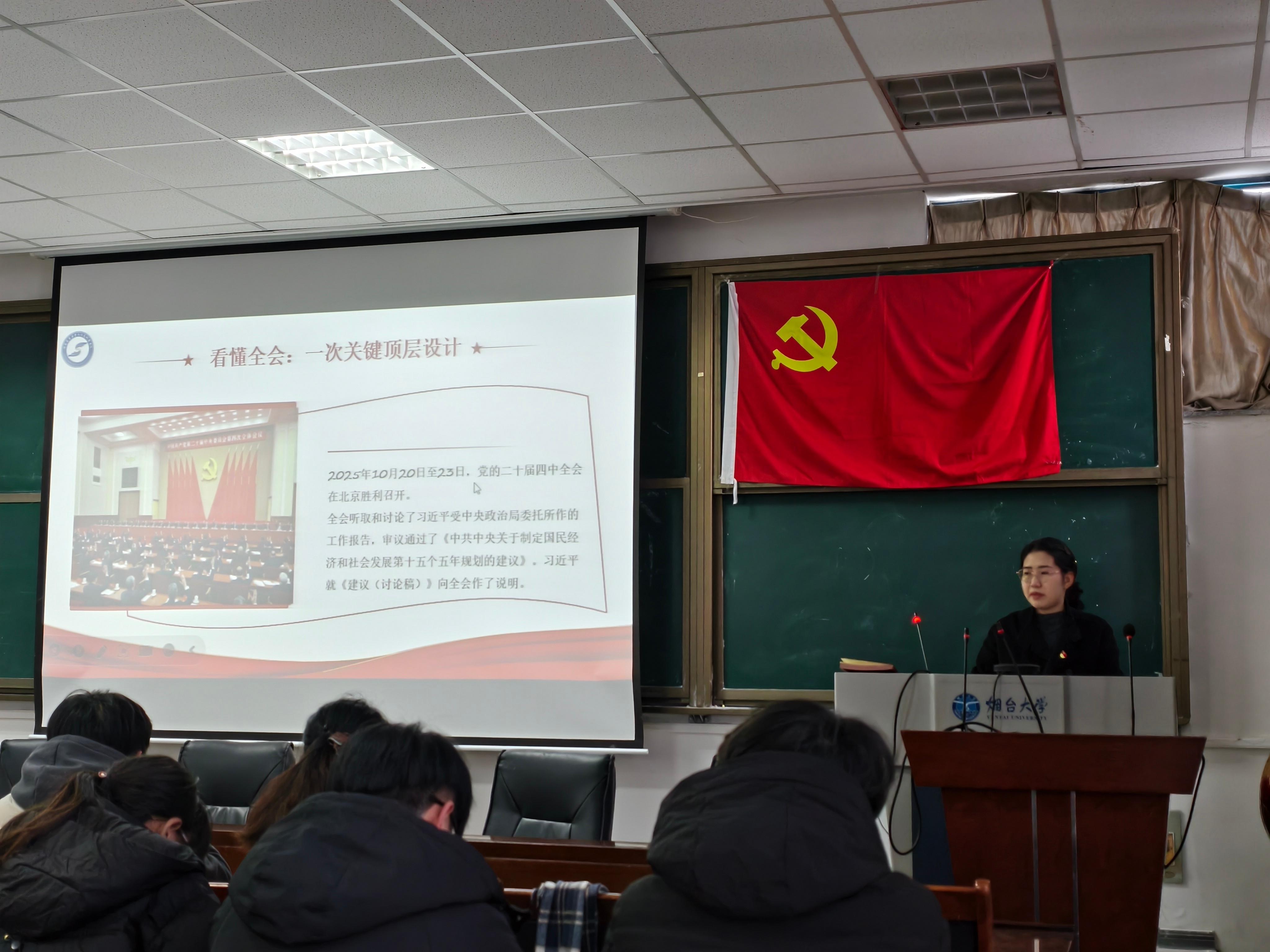 2025年12月4日,烟台大学数学与信息科学学院学生第一党支部召开主题党日,党支部书记张晔同志首先以“青春向党学全会 强国复兴勇担当”为主题领学党的二十届四中全会精神,解读重大战略部署与新时代要求,强调青年党员应自觉将个人理想融入国家发展。