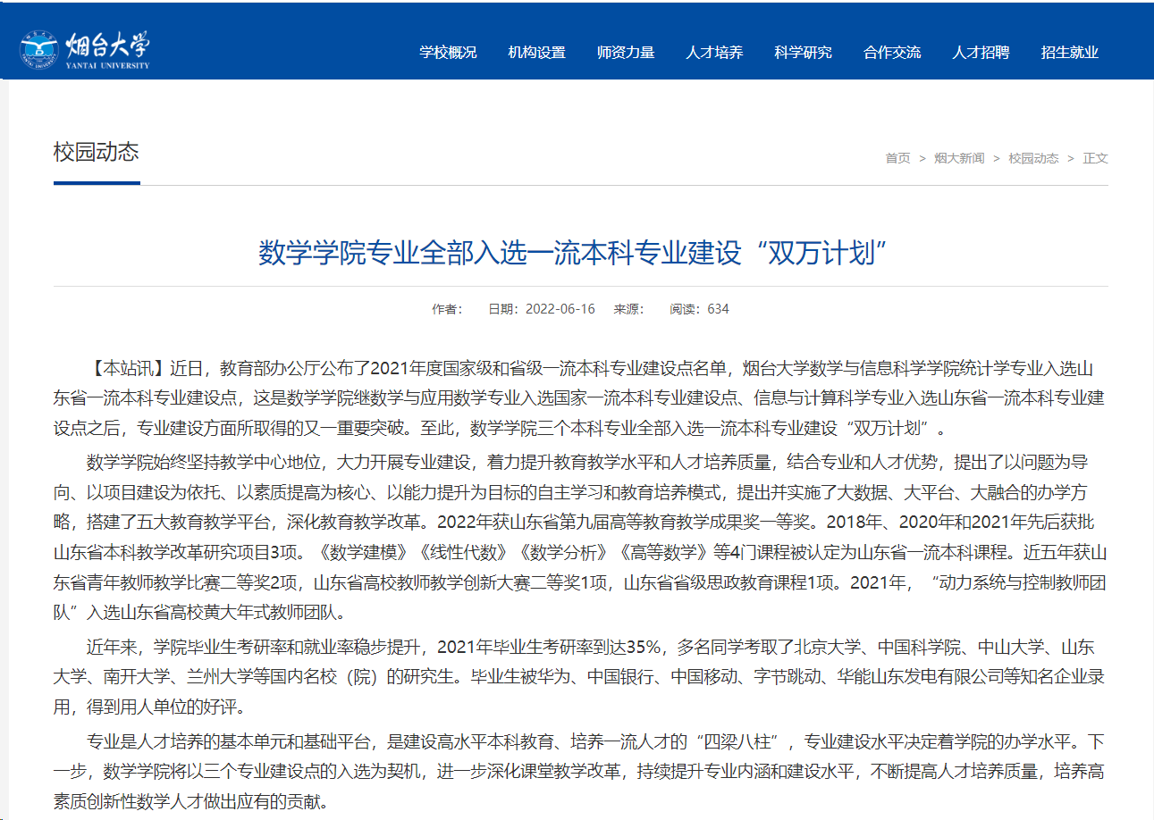 近日,教育部办公厅公布了2021年度国家级和省级一流本科专业建设点名单,烟台大学数学与信息科学学院统计学专业入选山东省一流本科专业建设点,这是数学学院继数学与应用数学专业入选国家一流本科专业建设点、信息与计算科学专业入选山东省一流本科专业建设点之后,专业建设方面所取得的又一重要突破。至此,数学学院三个本科专业全部入选一流本科专业建设“双万计划”。