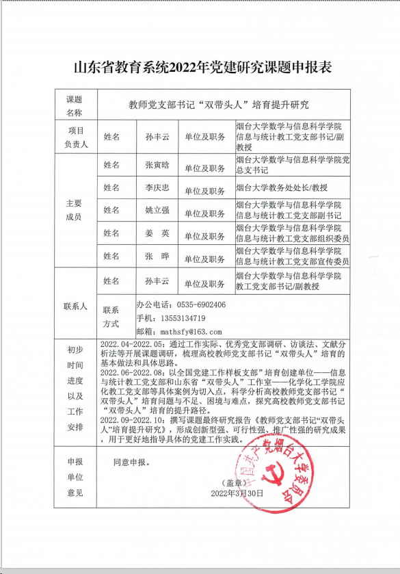 近日,中共山东省委教育工委下发《关于印发〈山东省教育系统 2022年党建研究参考选题〉的通知》。烟台大学数学与信息科学学院申报的《教师党支部书记“双带头人“培育提升研究》获批立项。