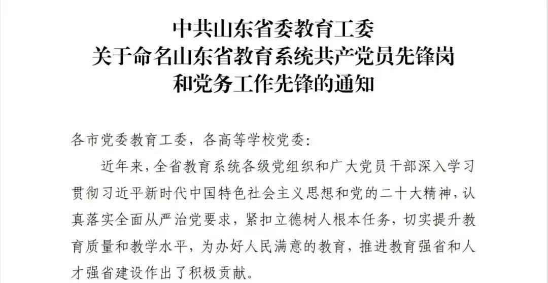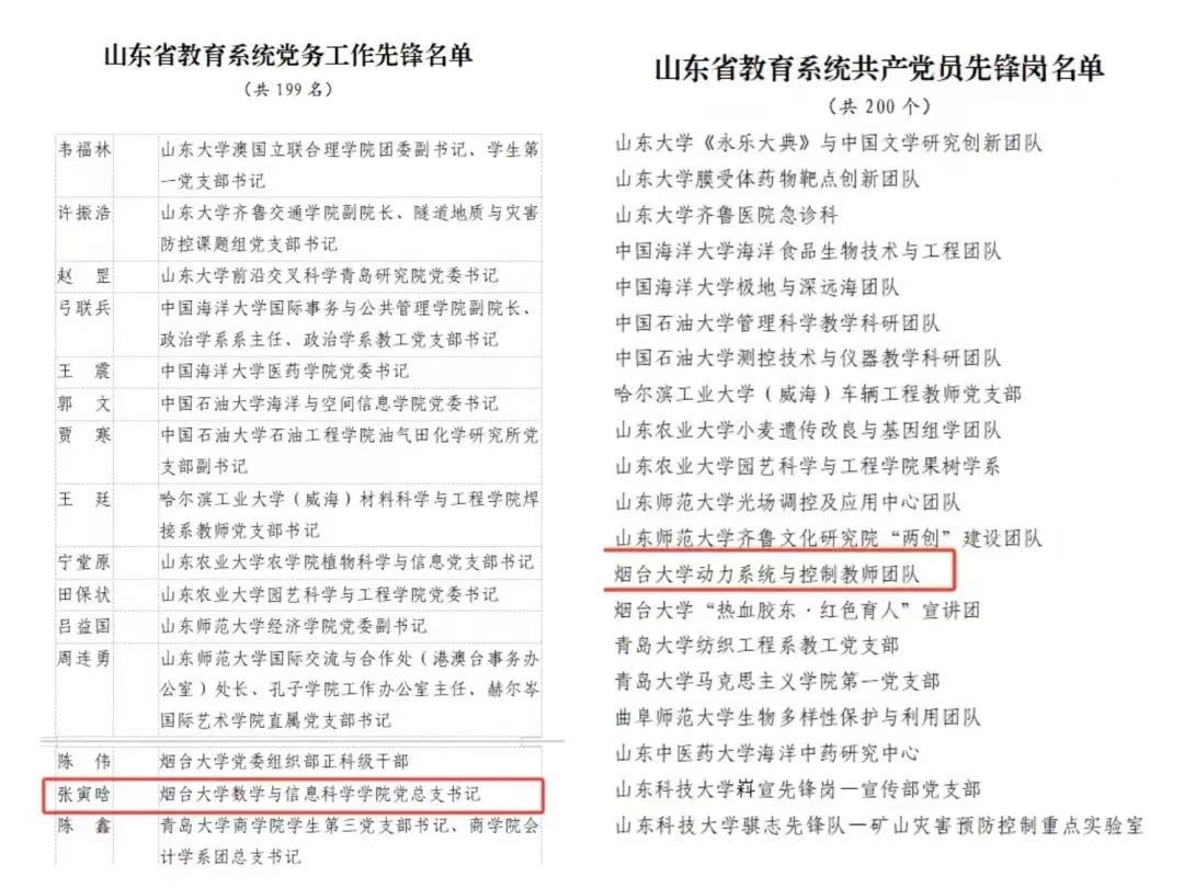 近日,中共山东省委教育工委印发《关于命名山东省教育系统共产党员先锋岗和党务工作先锋的通知》,数学与信息科学学院信息与统计教工党支部动力系统与控制教师团队获评“山东省教育系统共产党员先锋岗”称号,党总支书记张寅晗获评“山东省教育系统党务工作先锋”称号。